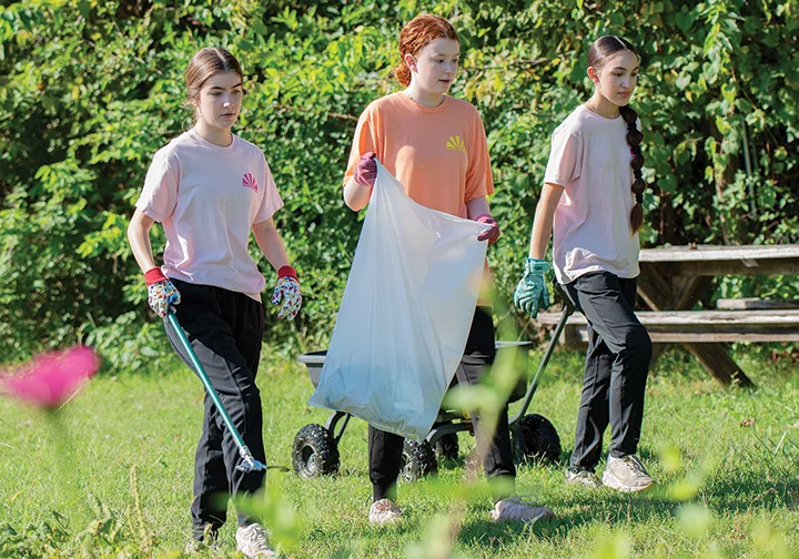 From left, Alexis Murray, Anna Henderson and Stella Martinez, all Ascension School eighth graders, perform cleanup tasks at New Roots Farm in Kansas City, Kansas. LEAVEN PHOTO BY KATHRYN WHITE