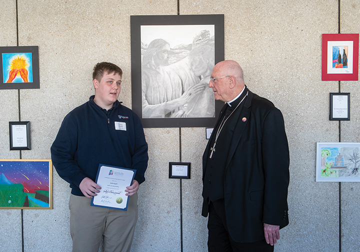 St. James Academy sophomore Joshua Kissel talks with Archbishop Joseph F. Naumann following the presentation of the Archbishop’s Invitational High School Art awards on March 13. Kissel received a Judge’s Award and a $100 prize. LEAVEN PHOTO BY JAY SOLDNER