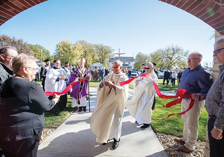 Father Reginald Saldanha, pastor of Sacred Heart Parish in Baileyville, cuts the ribbon and officially opens the new parish hall. The new building replaces the parish’s original school and church building, which was built in 1912. LEAVEN PHOTO BY JAY SOLDNER