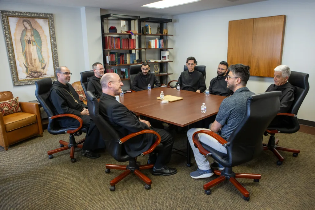Archbishop Shawn McKnight met with the monks of Mosteiro São José (St. Joseph Monastery) from Mineiros, Brazil, in July. Three Benedictine monks from Atchison helped found the community nearly 70 years ago. Pictured clockwise are: Archbishop McKnight, Abbot James Albers, OSB, Benedictines Father Jeremy Heppler, Brother Romário Wilson Vianna Peron, Brother Domingos Maria Lemes Borges, Father Thiago Ferreira Silva, prior of the monastery, Bishop Joaquim Carlos Carvalho and translator Nelson Sbravatti. LEAVEN PHOTO BY JAY SOLDNER