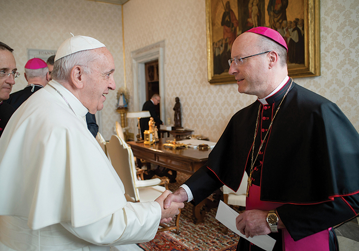 Pope Francis greets Bishop Shawn McKnight on Jan. 16, 2020, as part of a meeting with U.S. bishops from Iowa, Kansas, Missouri and Nebraska during their “ad limina” visits to the Vatican. CNS PHOTO/VATICAN MEDIAMay