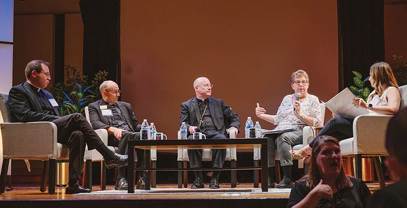 A panel — featuring, from left, Father Anthony Saiki, chancellor and promoter of justice; Father Mark Mertes, vicar general and vicar for clergy; Archbishop Shawn McKnight; and Helen Osman, consultant and pastoral communications specialist — was facilitated by Marissa Easter, far right, archdiocesan communications director. The panel members took turns handling questions about the archbishop’s vision that the small group discussions had given rise to. LEAVEN PHOTO BY KATHRYN WHITE