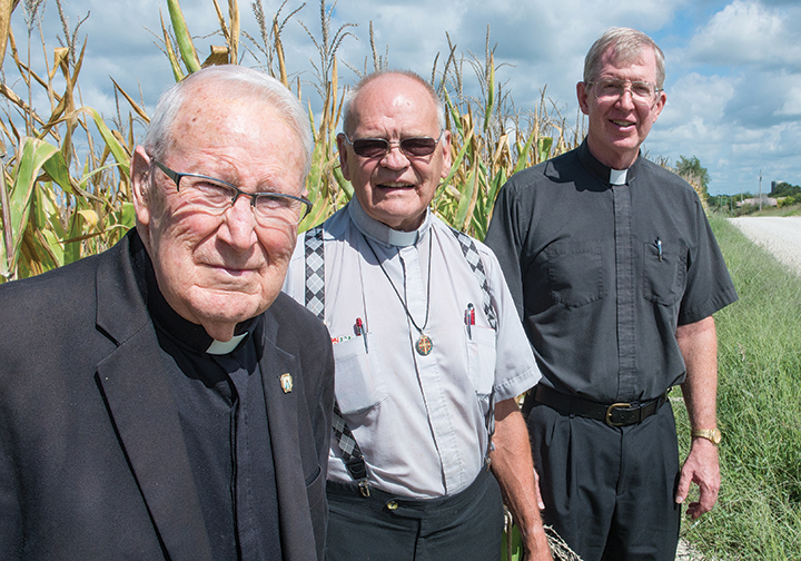 Father Earl Dekat, center, is seen here with his late cousin Father Carl Dekat, left, and Father Mike Peterson, right, in this 2017 file photo. Father Earl died on Jan. 9 at Home of the Flint Hills in St. George. His health had declined in recent years as he battled cancer. LEAVEN FILE PHOTO BY JOE BOLLIG
