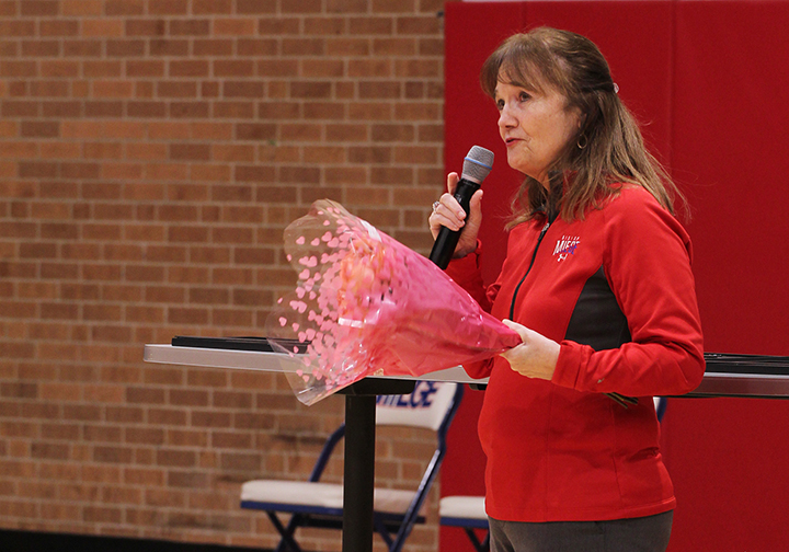 Elaine Schmidtberger of Bishop Miege High School in Roeland Park was the first recipient of the High School Counselor of the Year award. She was surprised in a ceremony on Feb. 6 at Miege. She has been at Miege for 42 years. COURTESY PHOTO