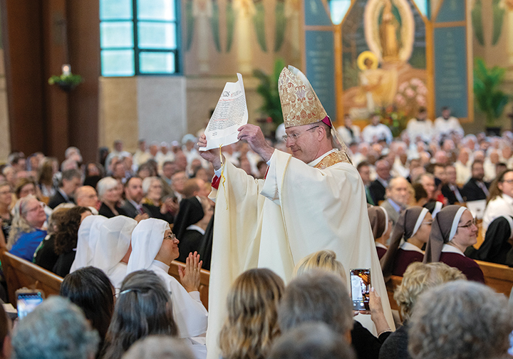 After accepting the apostolic mandate to lead the Archdiocese of Kansas City in Kansas, and its inspection by the archdiocesan College of Consultors, Archbishop Shawn McKnight displays the mandate for all the congregation to see. LEAVEN PHOTO BY JAY SOLDNER