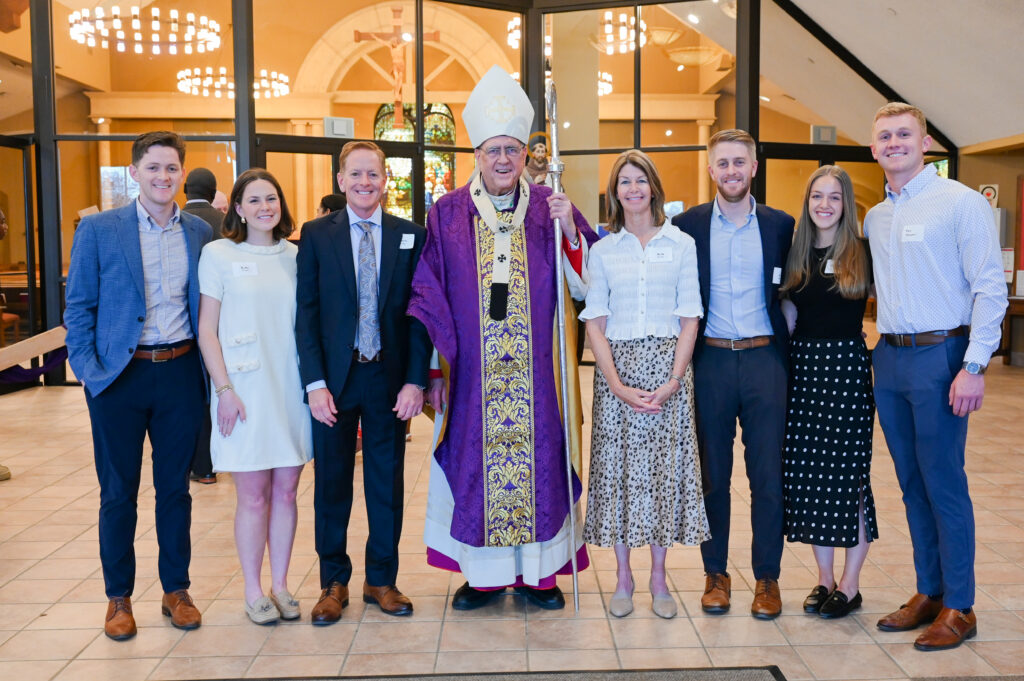 Archbishop Joseph F. Naumann pauses for a photo with the Krebs family following the Deo Gratias Mass at Church of the Ascension in Overland Park. LEAVEN PHOTO BY KATHRYN WHITE