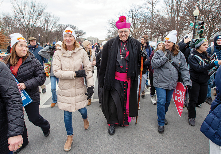 Archbishop Joseph F. Naumann joins tens of thousands of other marchers at the March for Life on Jan. 24. Marching with the archbishop are, from left, Kathryn White, archdiocesan foster and pro-life ministries coordinator; Debra Niesen, archdiocesan pro-life office consultant; and Angie Bittner, rural youth outreach coordinator. LEAVEN PHOTO BY JAY SOLDNER