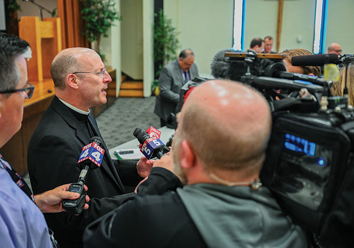Archbishop-designate W. Shawn McKnight talks with members of the media following a press conference at Savior Pastoral Center in Kansas City, Kansas, introducing him as the new archbishop of the Archdiocese of Kansas City in Kansas. He will be installed on May 27 at Church of the Nativity in Leawood. LEAVEN PHOTO BY KATHRYN WHITE