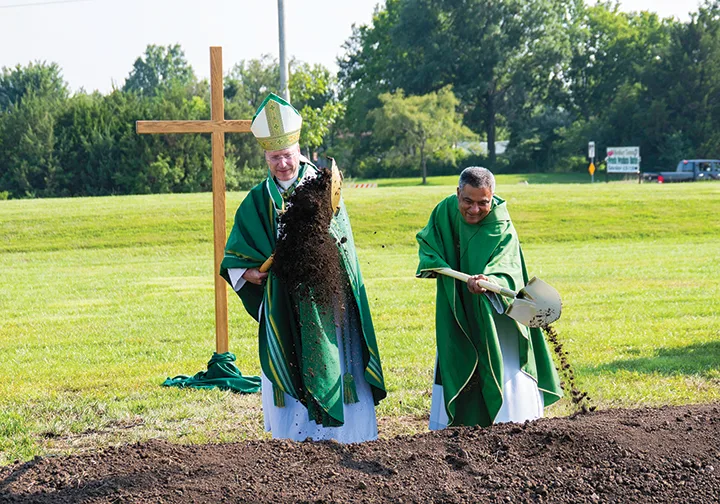 Archbishop Shawn McKnight and Father Tom Aduri, pastor of Mother Teresa of Calcutta Parish in Topeka, officially break ground on a new church on Aug. 2. When completed, the 14,000 square-foot church will feature seating for 500, a eucharistic adoration chapel, choir loft, cry room, bride’s room, ushers’ room, sacristy and a narthex. LEAVEN PHOTO BY KATHRYN WHITE