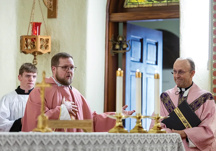 John Donart, Bob Rooney, and Will Sutherland stand before the congregation as they prepare to be ordained transitional deacons on May 17 at the Cathedral of St. Peter in Kansas City, Kansas. PHOTO BY MARY KATE KRAUSE