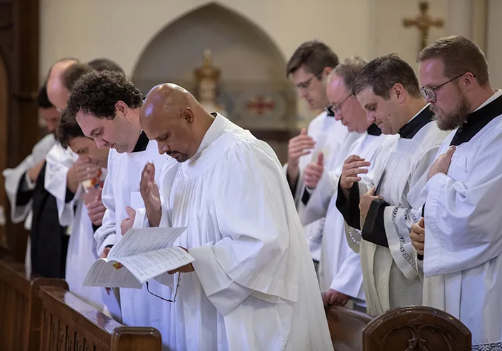 Nine priests were installed as pastors together by Archbishop Shawn McKnight (below) during solemn vespers at the Cathedral of St. Peter the Apostle in Kansas City, Kansas, on Aug. 17. LEAVEN PHOTO BY JAY SOLDNER