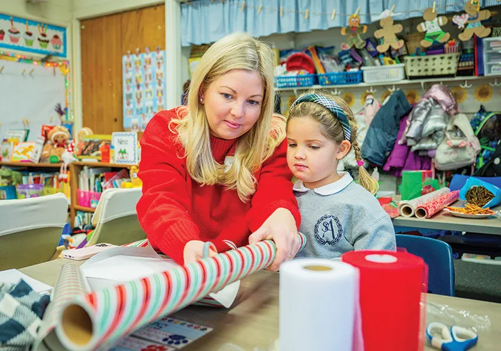 Emily Greene and her daughter Mary Grace cut wrapping paper for a gift for Red Bags KC. St. Ann School and friends of the parish collected gifts for 201 children this year, and the entire program collected gifts for 2,282 children and 72 families. LEAVEN PHOTO BY KATHRYN WHITE