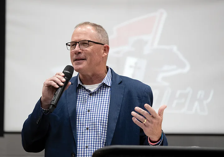 Andy Tylicki, president of St. James Academy, shares his thoughts on the school’s 20 years at a reception following Mass. LEAVEN PHOTO BY JAY SOLDNER