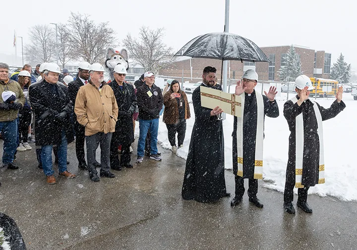 • St. Joseph School in Shawnee broke ground on the renovation of its St. Joseph Athletic Facility on Dec. 1. Father Michael Hawken blessed the space, with assistance from pastor Father Scott Wallisch and associate pastor Father Brent Stull.