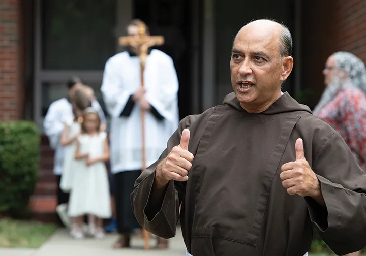 Father John Kolencherry, OFM Cap., pastor of St. Theresa Parish in Perry, gives the thumbs up for the start of the candlelight procession from the rectory to the church steps. LEAVEN PHOTO BY JAY SOLDNERSeptember