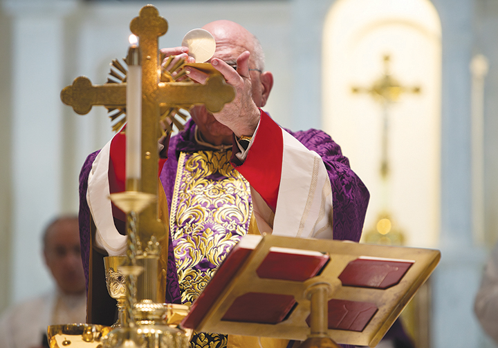 Archbishop Joseph F. Naumann elevates the host at Mass in Assumption Church held opposite the Kansas Capitol in Topeka on March 28. LEAVEN PHOTO BY JAY SOLDNER
