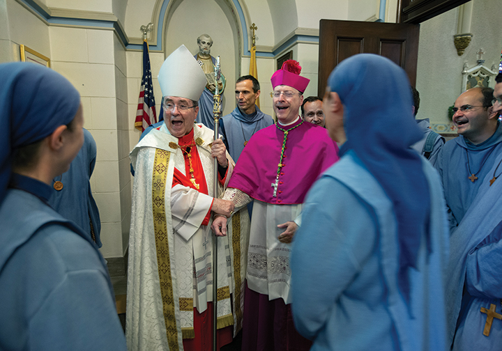 Cardinal Christophe Pierre, apostolic nuncio to the United States, and Archbishop McKnight enjoy a light moment with members of the Community of the Lamb. LEAVEN PHOTO BY JAY SOLDNER