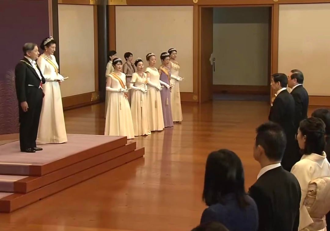* Prince Hisahito’s first time attending. And it used to be that the men stood to the left and the women to the right as you face them, but it seems they’re doing it mixed now as the Akishino family, including Kiko and Kako, are all together to the right. A small step towards equality maybe – or maybe the fact that it ensures Aiko, the Emperor’s daughter who can’t succeed to the throne, continues to stand next to them instead of being halfway down the line. I do wonder how they feel about Hisahito coming of age as the future Emperor when their daughter is sidelined for being a woman (or maybe they consider it a blessing that she can escape).