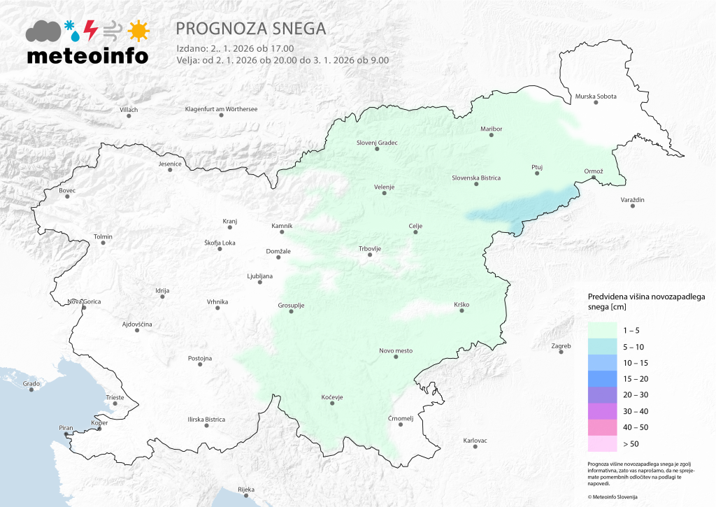 Nekaj padavin vzhodno, južno in deloma osrednjo Slovenijo čaka v noči na soboto, nato nekaj tudi v noči na nedeljo. Količina padavin bo precej majhna, a snežinke lahko ponekod ponovno pobelijo tla. Na severozahodu Slovenije, kjer bo v Kranjski Gori potekala tekma svetovnega pokala alpskih smučark, bo ves vikend večinoma sončno in mrzlo.