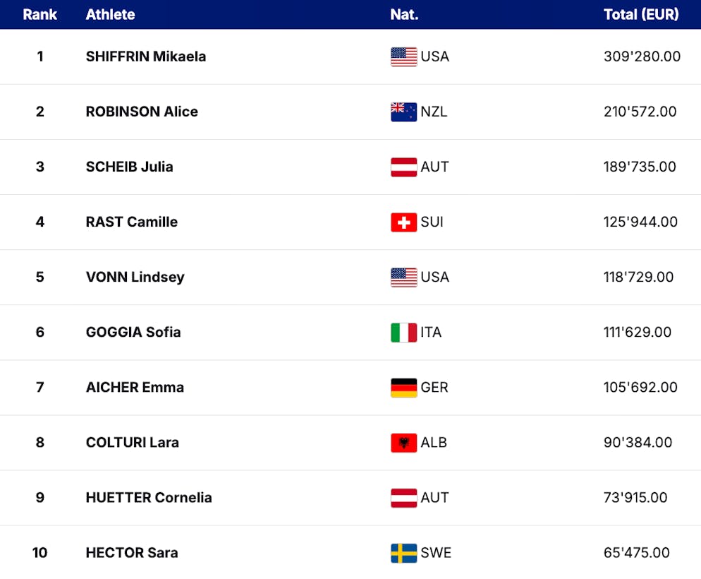 Auch Alice Robinson (210’000 Euro) und Julia Scheib (189’000 Euro) haben in dieser Saison bereits ordentlich zugelangt. Bei den Schweizerinnen hat wenig überraschend Camille Rast am meisten abkassiert. Im Gesamtranking liegt die 26-Jährige mit 126’000 Euro (117’000 Franken) auf dem 4. Rang.