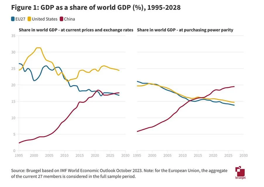 Once differences in the cost of living between countries are corrected, we observe exactly the same decrease for the United States (right graph). The European Union, like the United States, has seen its share of global GDP fall from 20% in 1995 to 15% today.