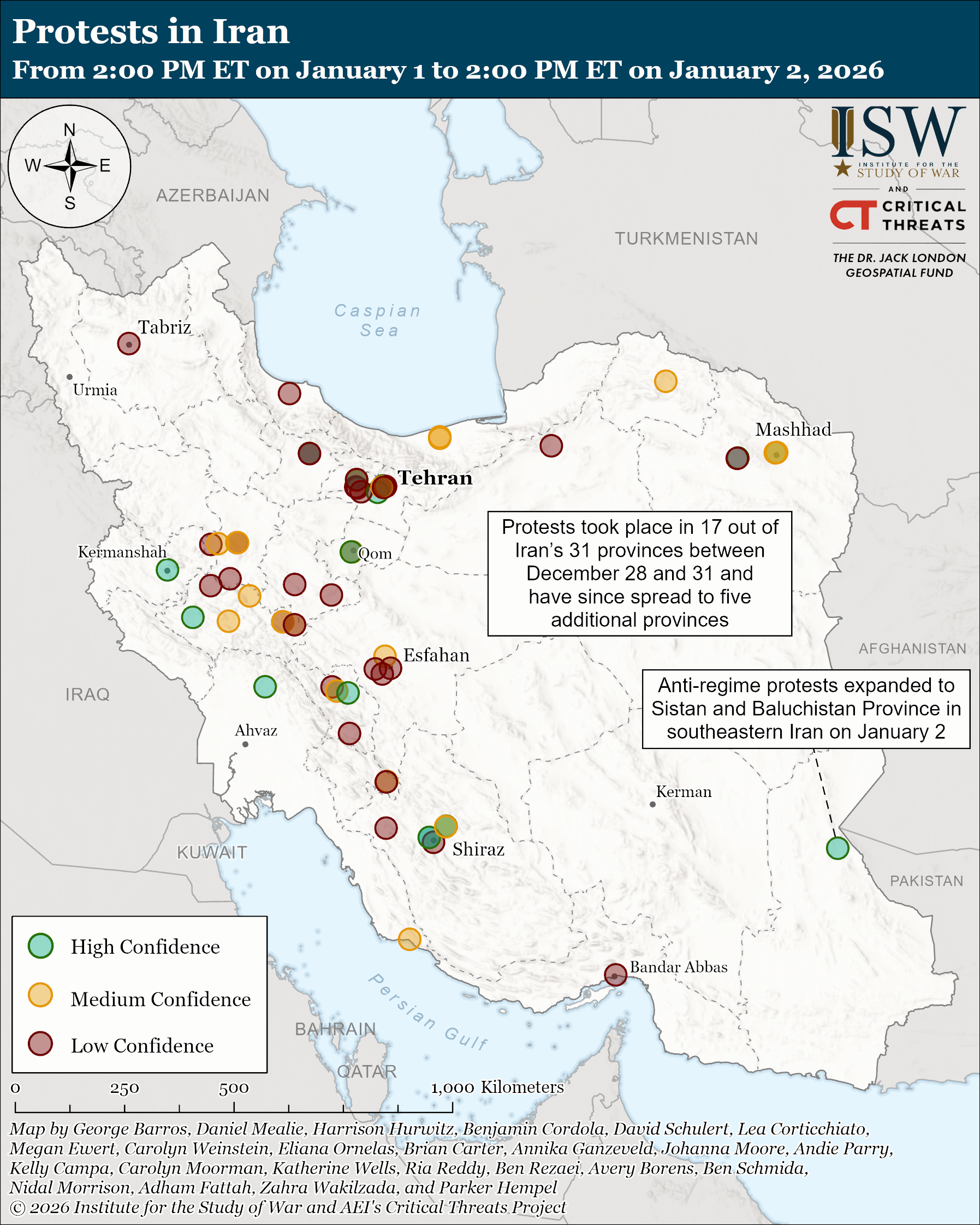 Note: This update covers information for the 48-hour period between 2:00 PM ET on December 31, 2025, and 2:00 PM ET on January 2, 2026. CTP-ISW did not publish an Iran Update on January 1 in observance of New Year’s Day.Â