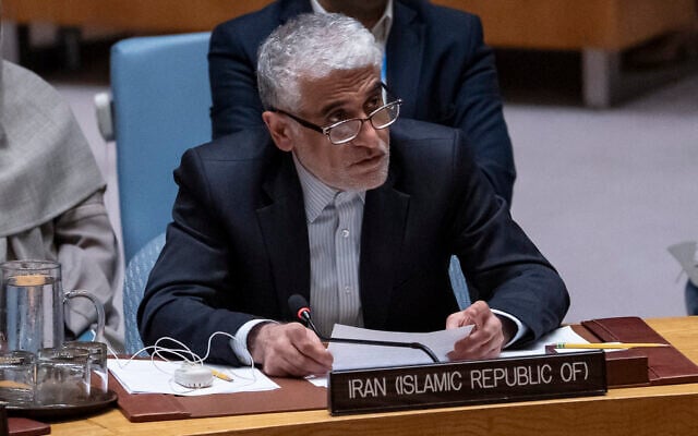 Iran’s Ambassador to the United Nations Amir Saeid Iravani speaks during a Security Council meeting at UN Headquarters, June 24, 2025. (AP Photo/Yuki Iwamura)