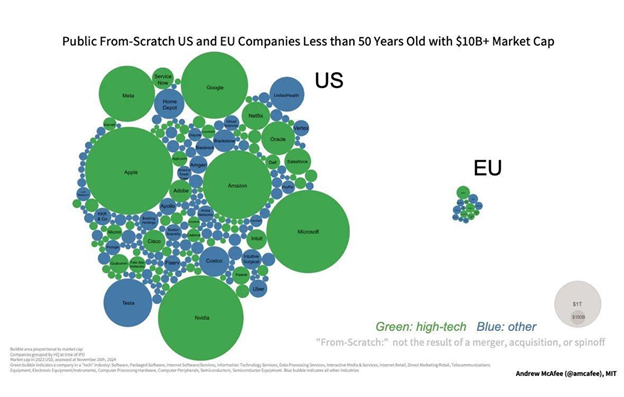 The technological gap between the US and Europe can be attributed to several factors. First, the US has a far deeper and more dynamic ecosystem for financing startups, while Europe still lacks a genuine capital markets union, limiting the scale and speed at which new firms can grow.