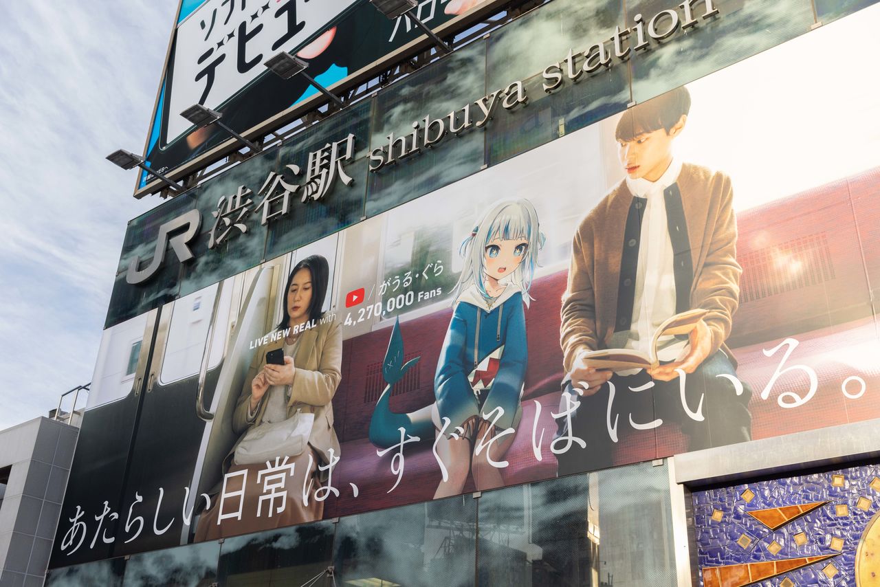 An advertisement for the popular VTuber Gawr Gura displayed at Shibuya Station in Tokyo, March 2023. (© Stanislav Kogiku/SOPA Images/Sipa USA/Reuters)