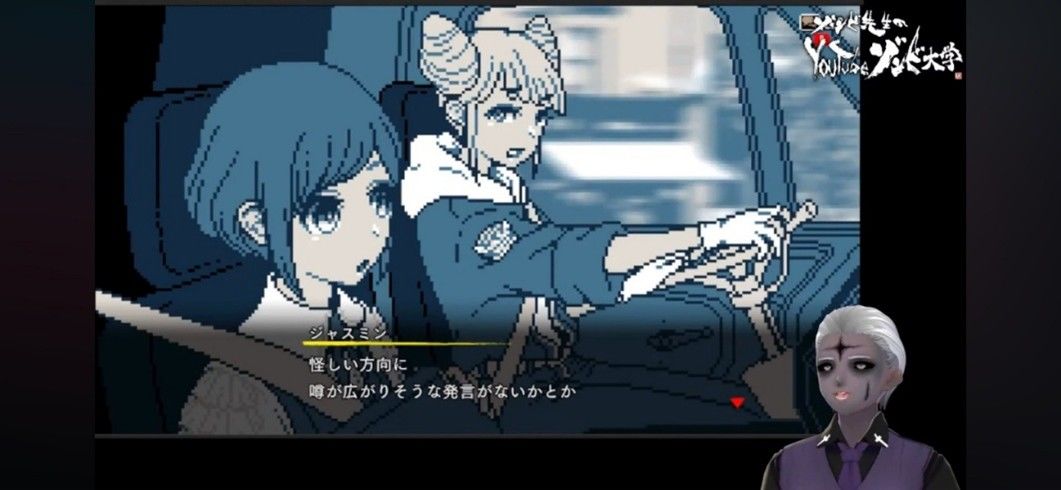 VTuber Zombie-sensei (bottom right) livestreaming a commentary on the game Urban Myth Dissolution Center. (Game © Hakababunko/Shūeisha Games; image courtesy Okamoto Takeshi)