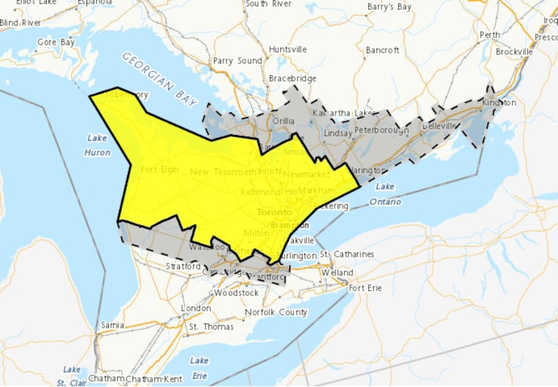 Late Sunday afternoon, Environment Canada issued a yellow snowfall warning for Burlington-Oakville, Caledon, the City of Toronto, Halton Hills-Milton, Mississauga-Brampton, Newmarket-Georgina-Northern York Region, Pickering-Oshawa-Southern Durham Region, Uxbridge-Beaverton-Northern Durham Region, and Vaughan-Richmond Hill-Markham.