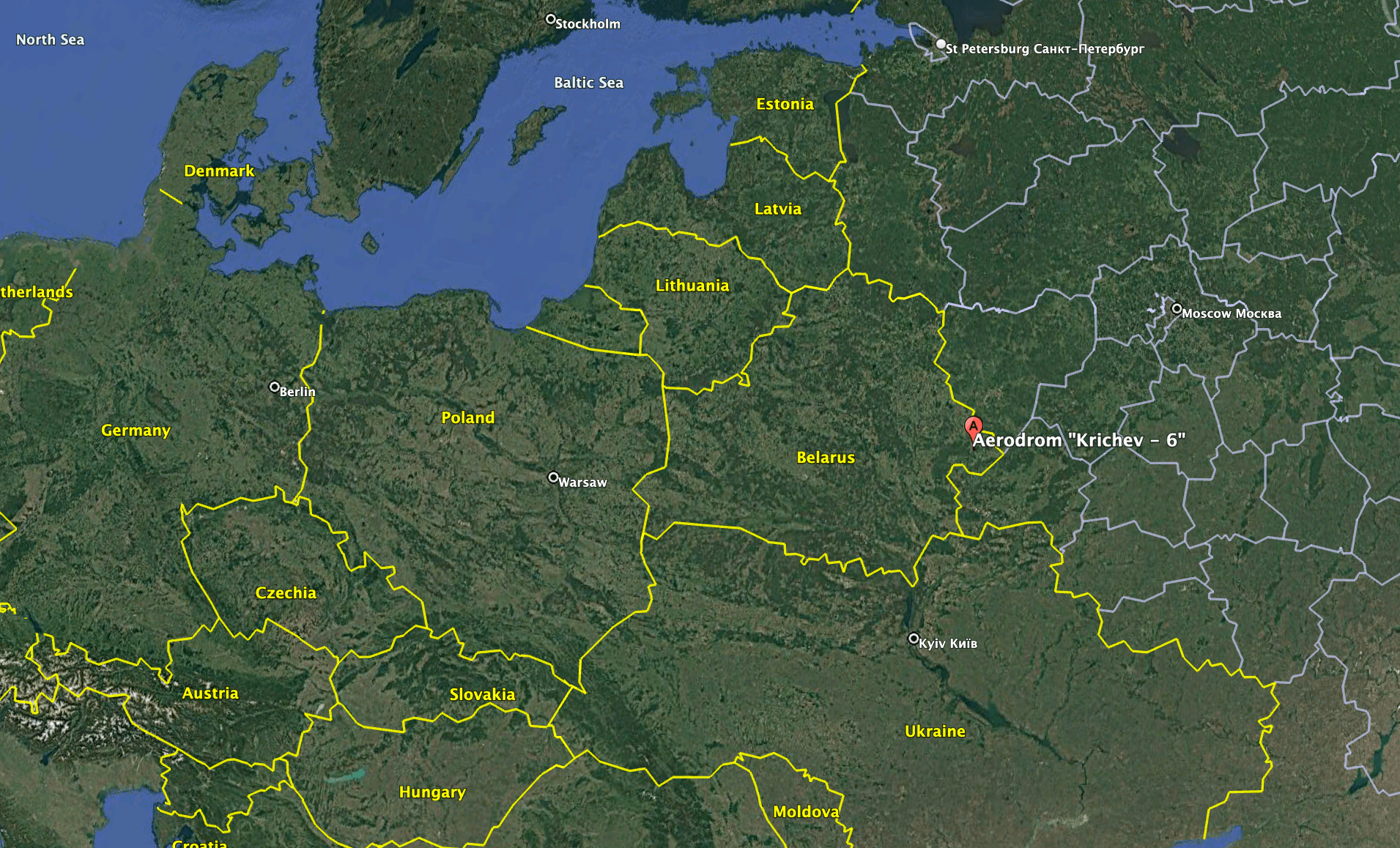 The approximate location of Krichev (also known as Krichev-6) in relation to the wider region. Google Earth