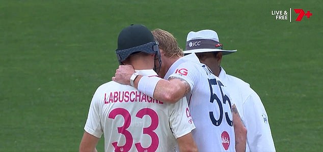 Stokes looked furious at Labuschagne, before the England batter approached him and wrapped his arm around the Aussies’ neck, appearing to whisper something in his ear.