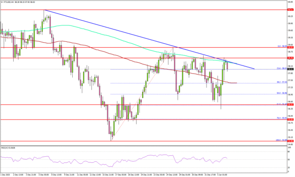 A key bearish trend line is forming with resistance at $58.30 on the 4-hour chart.