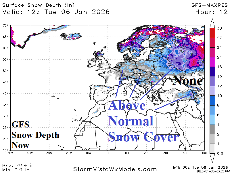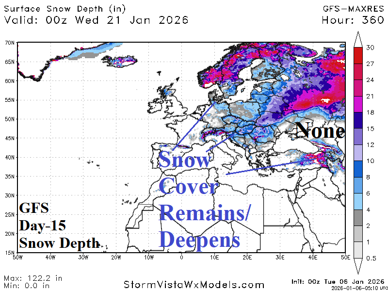 Discussion: Very cold weather is developing across France and Northwest Eurasia to begin the New Year (Fig. 1). The GFS 1-7-day forecast indicates expansive cold to very cold weather enhanced by widespread above normal snow cover (Fig. 2). Both GFS and ECM agree that arctic air becomes involved in the 8-14-day period adhering to East Europe and West Russia (Fig. 3). Snow cover is above normal as indicated by GFS for midday today (Fig. 4) and increases/deepens over the next 2 weeks (Fig. 5). A strip of stratospheric warming across Southern Eurasia inspires the frigid weather pattern enhanced by the deep snow cover. Probability is HIGH that 0F reaches Eastern Europe in the 6-10-day period. Very cold 10’s extends across Southwest Russia where ground is bare throughout the cold event raising crop concerns.