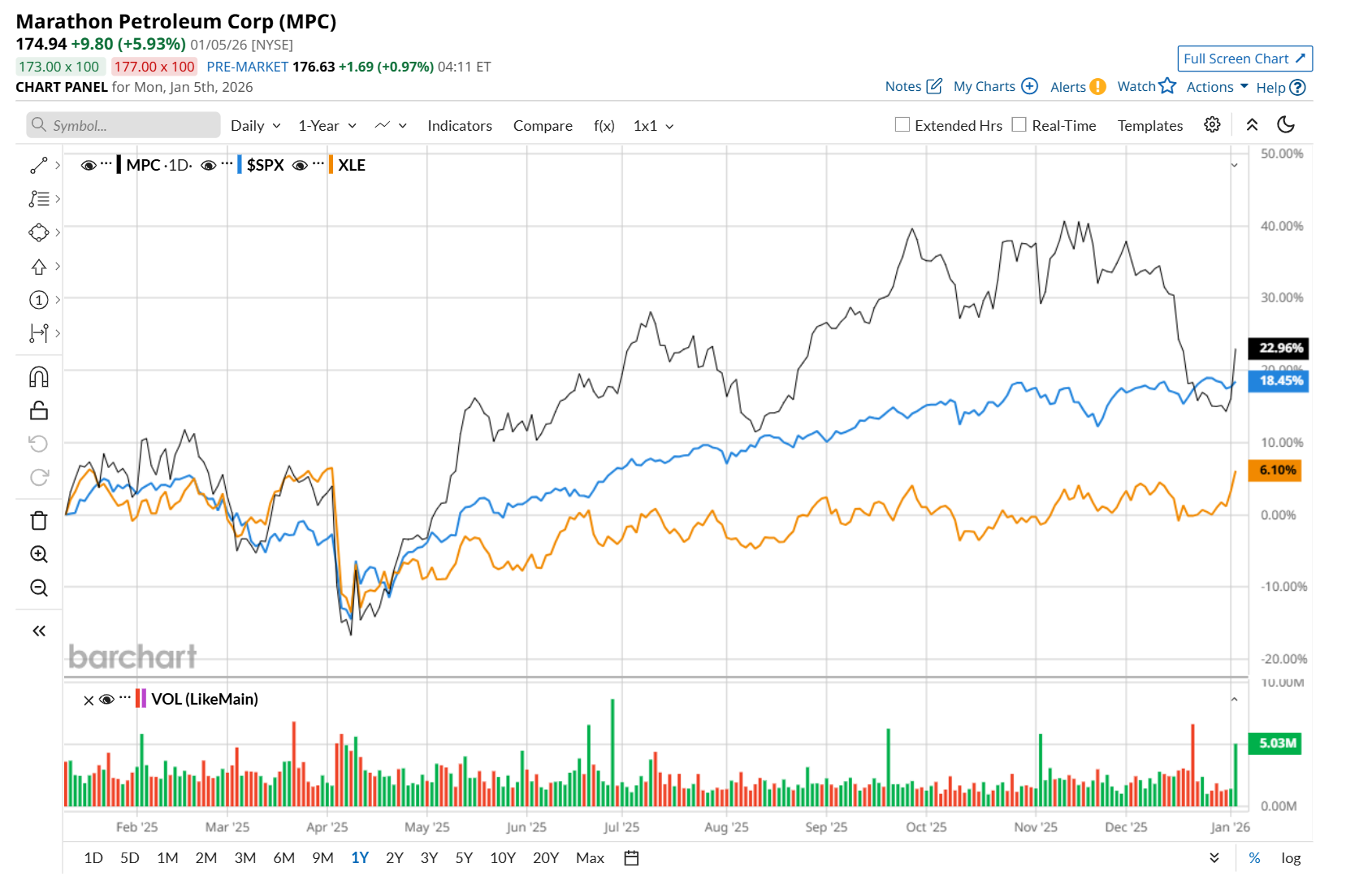 MPC has rallied 22.6% over the past 52 weeks, outpacing both the S&P 500 Index’s ($SPX) 16.2% rise and the State Street Energy Select Sector SPDR ETF’s (XLE) 7.2% uptick over the same time period.