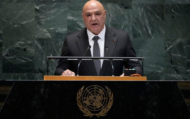 Lebanon President Joseph Aoun addresses the 80th session of the United Nations General Assembly, September 23, 2025, at UN headquarters. (AP/Pamela Smith)