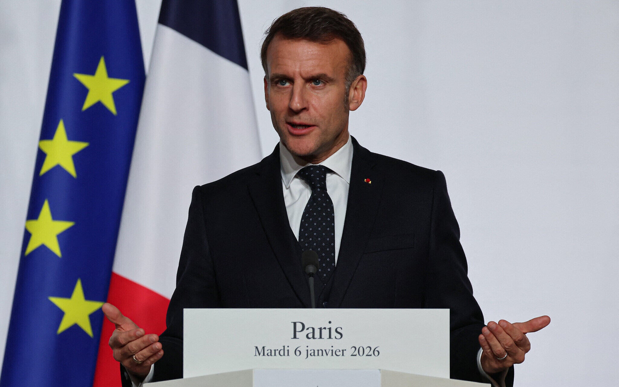 France’s President Emmanuel Macron delivers a press conference upon the signing of the declaration on deploying post-ceasefire force in Ukraine during the Coalition of the Willing summit on security guarantees for Ukraine, at the Elysee Palace in Paris on January 6, 2026. (Ludovic MARIN / POOL / AFP)