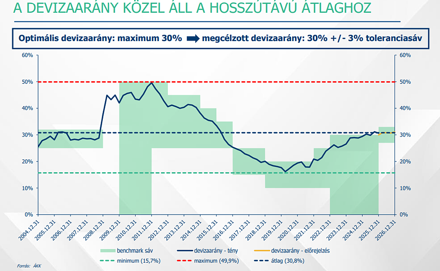 A devizaadósságot továbbra is a teljes állomány 30 százalékán tartaná az Államadósság Kezelő Központ, amihez egy +/- 3 százalékpontos toleranciasáv tartozik. Idén 3,1 milliárd euró devizatörlesztés esedékes, ami kiegészül 6,5 milliárd euró nettó devizakibocsátással (2541 milliárd forint). Ám utóbbihoz csak részben lesz szükség kötvényaukciókra, mert 2 milliárd eurót olcsóbb forrásból, az Európai Unió SAFE keretéből tervez lehívni az ÁKK.