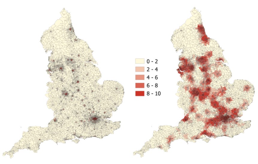The maps below compare accessibility to employment opportunities across England, by public transport (left) and by car (right), using public data from the Department for Transport (DfT). Outside of the large cities, public transport is not sufficient to access work. In contrast, accessibility by car is far better. If you compared accessibility to groceries, GPs and primary schools, you’d find the same story.