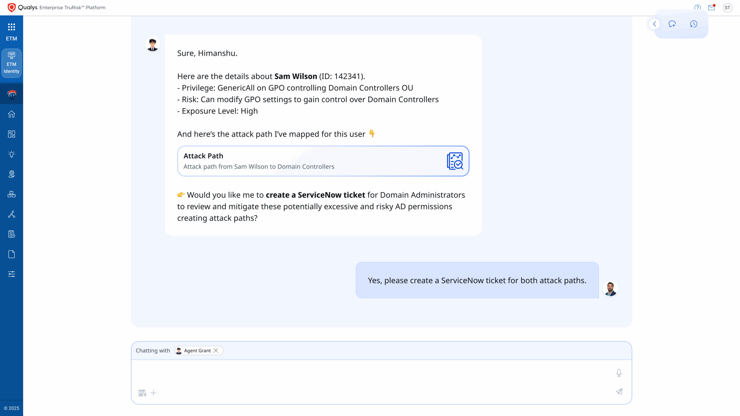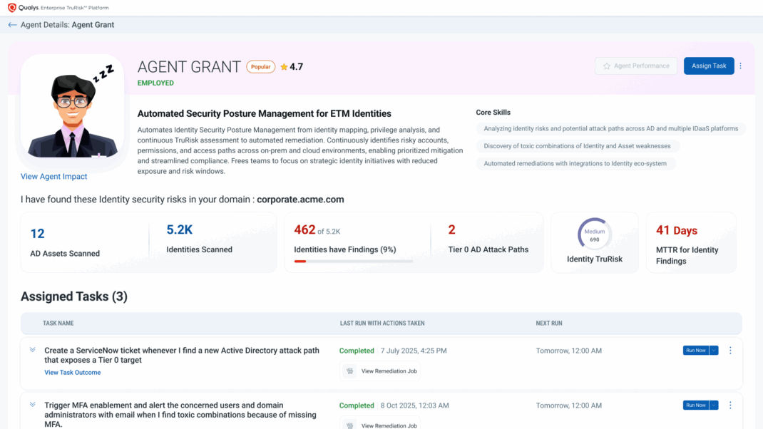 Identity is now the #1 attack surface. Agent Grant in Qualys ETM Identity uses agentic AI to measure and reduce identity risk across AD, Entra, Okta & other cloud IdPs/IDaaS. It operationalizes identity risk by turning messy Active Directory & identity-risk signals into validated, prioritized, and closed-loop actions with proof of risk removed.