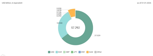 The international reserves of Ukraine’s central bank mostly consist of US dollars ($37 billion), while 27.8% are held in euros (equivalent to almost $16 billion), according to NBU data as of Jan. 1, 2026.