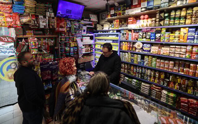 A shop owner serves customers at a store in the Iranian capital, Tehran, on January 7, 2026. (ATTA KENARE / AFP)