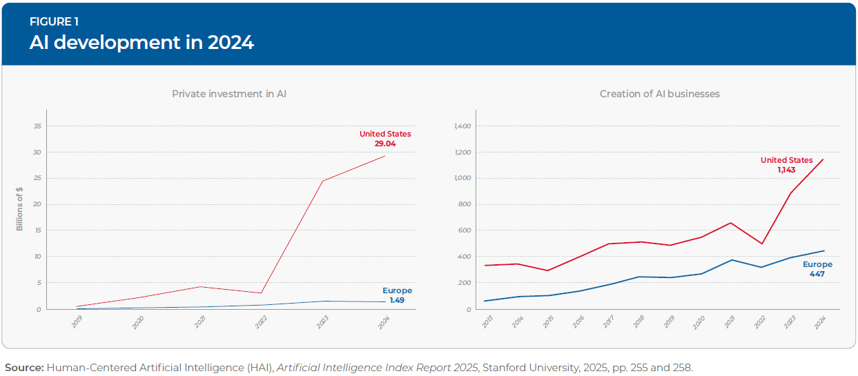 The development of a dynamic and competitive digital ecosystem requires substantial investment and the presence of large companies, but also a large number of young companies. By imposing barriers to entry on small businesses and a surcharge on the entire ecosystem, the AI Act risks bringing about an automatic slowdown in AI development in Europe, leading it to fall further behind the United States. This is all the more likely given that digital technologies, with their network effects, provide a competitive advantage to first movers and companies that are able to quickly achieve critical mass.