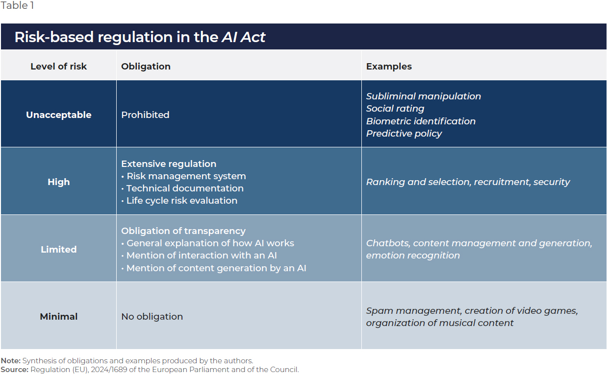 The general idea behind this regulation is to impose obligations upon AI suppliers and deployers based on their product’s presumed risk. As shown in Table 1, four levels of risk are stipulated, from minimal to unacceptable, with specific constraints for each. Intuitively, this approach based on risk makes sense, since it aims to encourage businesses to take appropriate precautions. This is what is done when it comes to health care, the environment, and defective products.