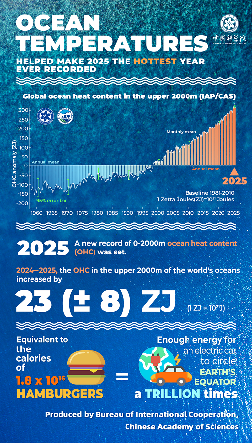 Published in the journal Advances in Atmospheric Sciences, the report showed that the global ocean heat content in the upper 2,000 meters set a record for the ninth consecutive year, increasing by 23 zettajoules compared to 2024. This amount of energy could power an electric car to circle Earth”s equator a trillion times.