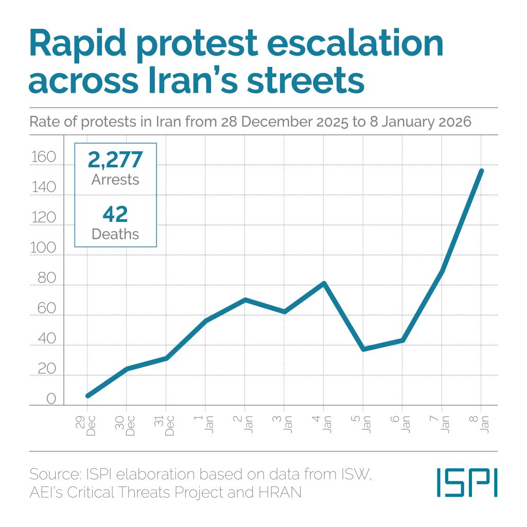 “There has been little by way of negotiations on the Iranian nuclear programme since June, while the eruption of protests in late December – initially over economic grievances, but quickly expanding into anti-regime unrest – adds a significant challenge to the Iranian government from below. Trump has at least twice thus far warned of potential US action if the repression intensifies. That puts Tehran’s decisionmakers in a quandary: it has long resorted to the iron fist in quelling past rounds of nationwide unrest, most recently during the 2022 Women, Life, Freedom protests. But reprising that playbook more than it already has to quell discontent now runs the possibility of some form of intervention from abroad – and Tehran’s decisionmakers are likely at a loss to know what covert or overt options may be on the table, and how targeted or sweeping they could be. Looking beyond the protests, the prospect of an agreement with Washington looks even more distant now, with the US unlikely to settle for anything Iran’s government may be willing to offer. That suggests that even an ebb in the ongoing unrest is likely to prove a temporary reprieve as the economy misfires due to mismanagement, corruption and sanctions, and the regime refuses to budge on the fundamentals of its exclusionary approach to governance.”