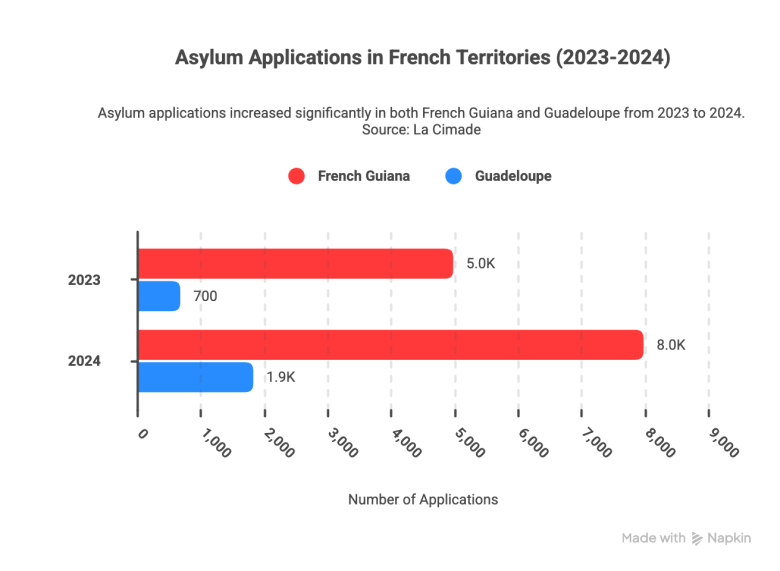 In French Guiana, asylum applications jumped from 5,000 in 2023 to 8,000 in 2024. Requests in Guadeloupe rose from roughly 700 to 1,850. As of October 2025, French Guiana had already recorded 7,500 applications. Overall, advocates are saying the trend has stabilized but not slowed.