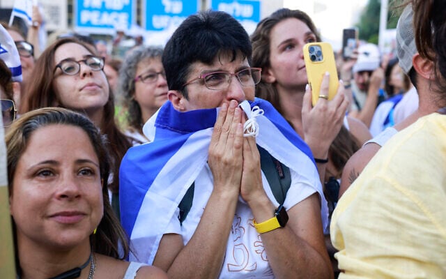 A woman reacts as people celebrate at Hostages Square in Tel Aviv as news came out that Hamas had already handed over seven surviving hostages to the Red Cross on October 13, 2025. (Menahem Kahana / AFP)