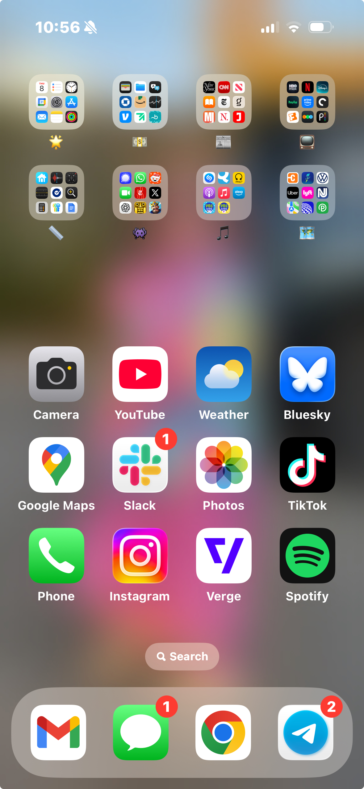 The top half of my homescreen is devoted to folders for things like streaming music and TV, news, navigation, social media, banking, etc. The bottom half is for my most-used apps: Instagram, Spotify, Google Maps, Photos, Camera, and, of course, The Verge. Those can change sometimes. For example, I’ll move Instagram and TikTok out (or delete them entirely), if I’m in the mind to reduce my doomscrolling. The dock is reserved for nonnegotiables: Gmail, iMessage, Telegram, and Chrome. My wife is the opposite. Her phone is just a chaos of random apps spread across multiple screens. Couldn’t be me.
